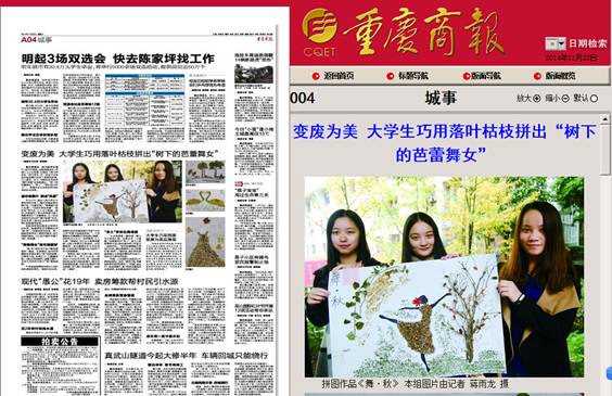 12月27日,重庆南岸区电视台,从商报了解到我们的活动后很感举,联系我们进行了采访并邀请同学们现场制作落叶拼图,并于12月4日对活动进行了新闻报道。视频观看网址:http://nanan.cbg.cn/2014/1204/560559.shtml