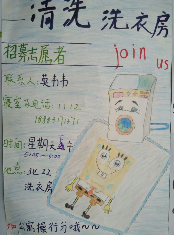当然,为了加强同学们的热爱劳动,热爱清洁的意识,我们更希望同学们也能加入其中,和我们一起分享其中的乐趣。因此,我们宣传部专门制作了海报来招募清洗洗衣房的志愿者,还有操行分可以加哦!
